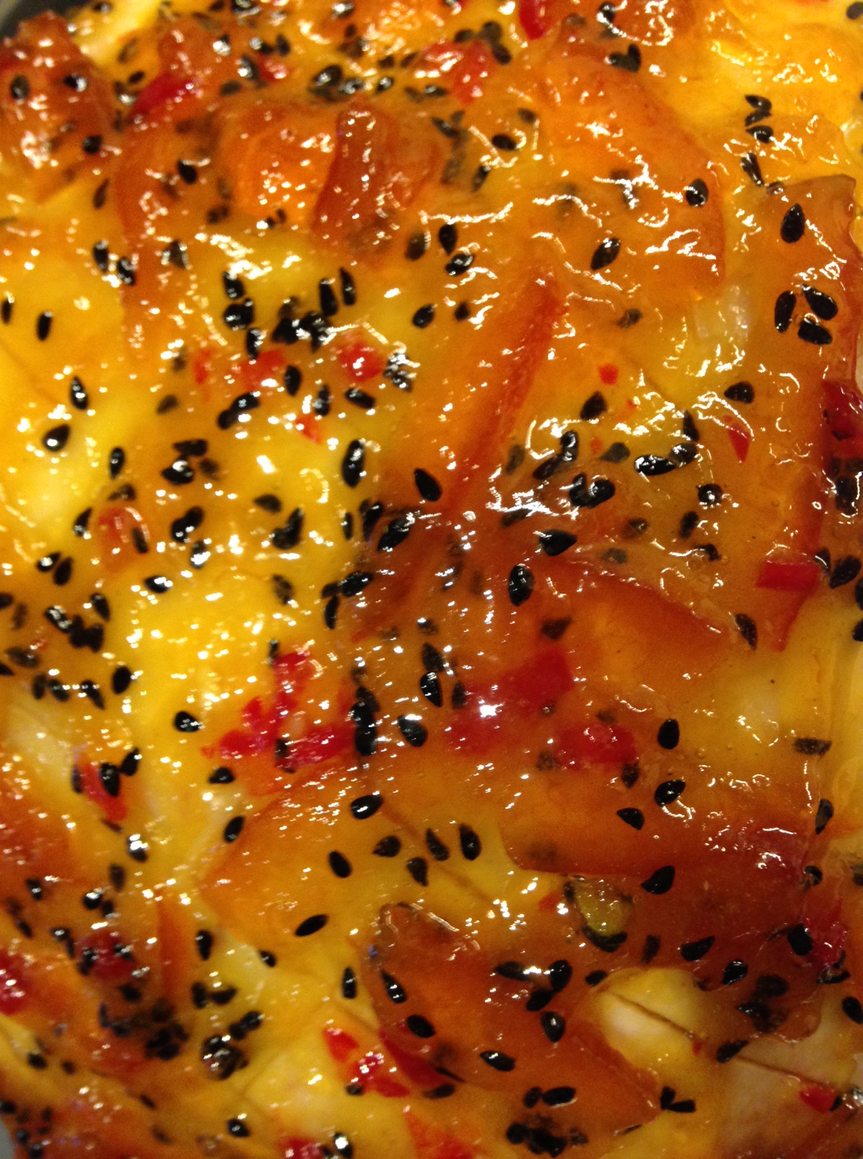 • For the glaze: marmalade, mustard of your choice, black onion seeds, fresh red fruit chilli, we used a rocoto.