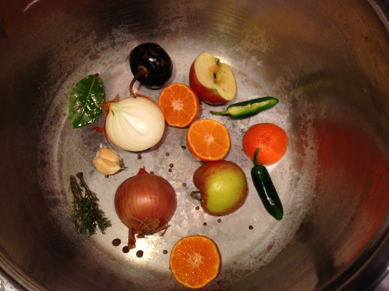 • For the boiling pot: dried casabel, whole onion, couple of tangerines, fresh bay leaf, fresh thyme sprigs, a few garlic cloves, an apple, jalapeños, allspice berries and peppercorns. Do not stress too much peeling or prepping this as it will all be discarded.