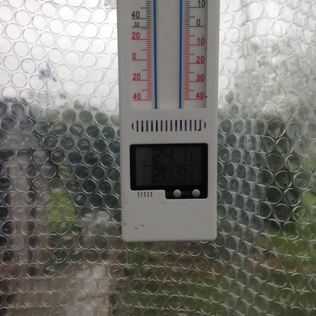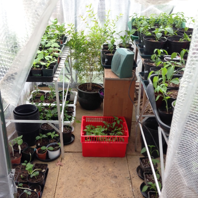The plants been up in our heated, bubble wrapped greenhouse for nearly a week and the results are good. All round light, controlled temperature and gentle air flow has really allowed the plants to flourish. We’ve been trying to keep the temperature above 15 degrees at night, so far no problem, despite outdoor temperatures hovering around zero. Temperatures during the day are less than perfect. It can often be well over 35 degrees in there, with window and door open. We’ve attempted some strategic placing of the hotter types on the South side and the ones that are less tolerant of high temperatures on the North side or somewhat under the shelving. Generally all the plants have added a couple of extra sets of leaves and are looking tip top.