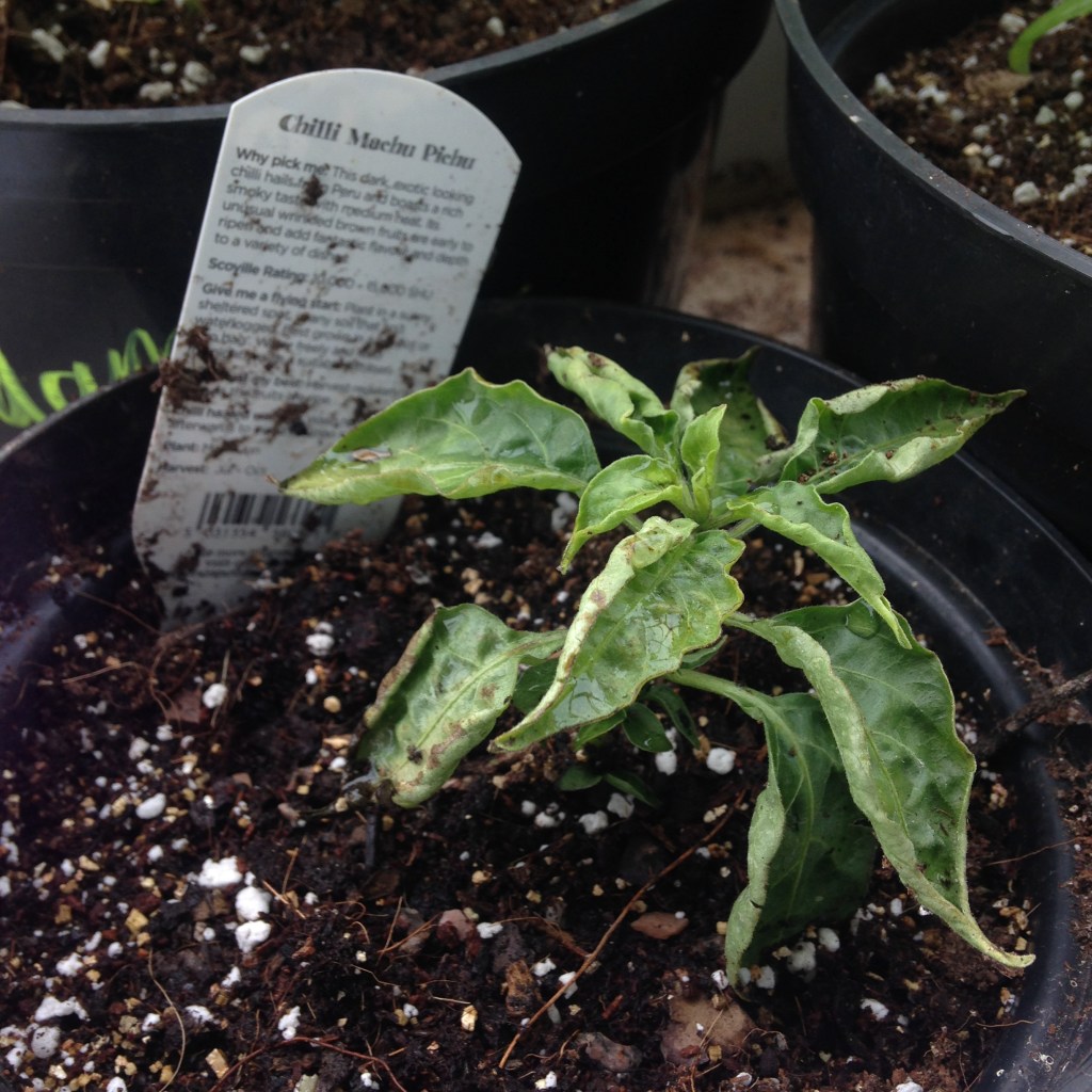 When visiting our local garden centre Machu Pichu potted chillies were being sold for £4 each. They were tempting – as all chilli plants are. We left them behind. A couple of weeks passed and we returned (more potting grit required). There they were, on the bargain shelf, looking decidedly sorry for themselves. £1 each said the label. We decided to risk three. When we got to the till the lovely lady offered us a further discount of ’50p for all three’ as they were looking so rough. Crispy, dirty leaves. Sodden compost and virtually no new growth nodes. We’ll take them!