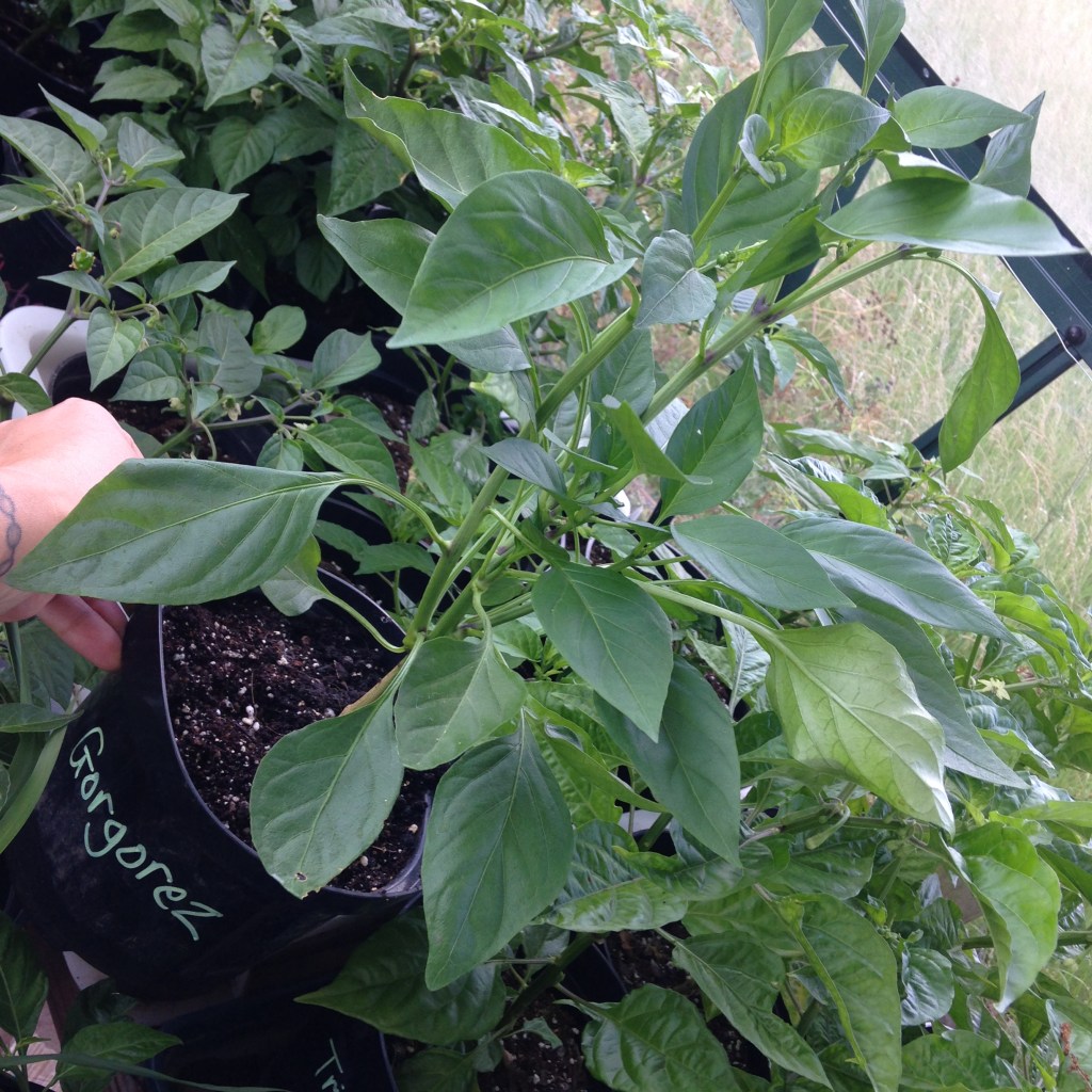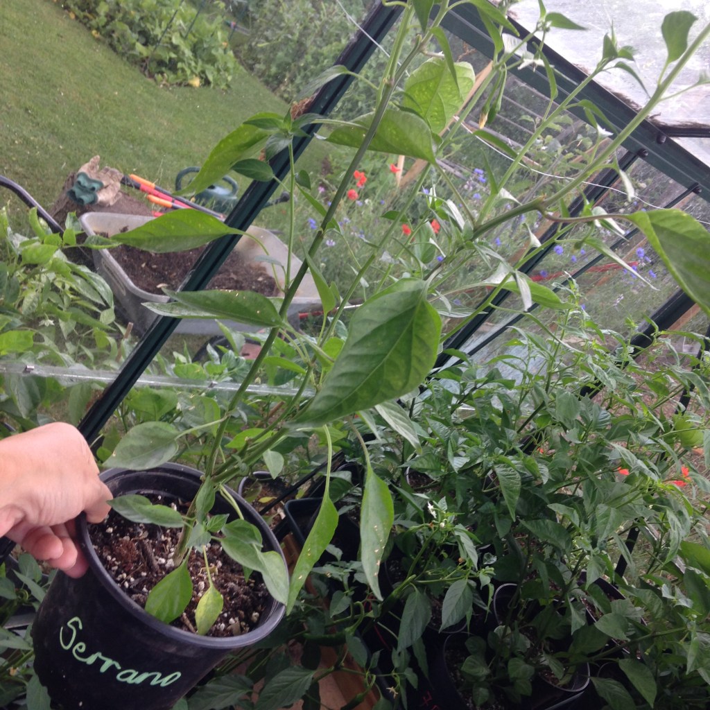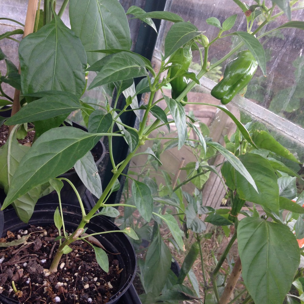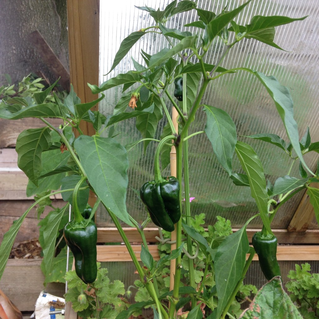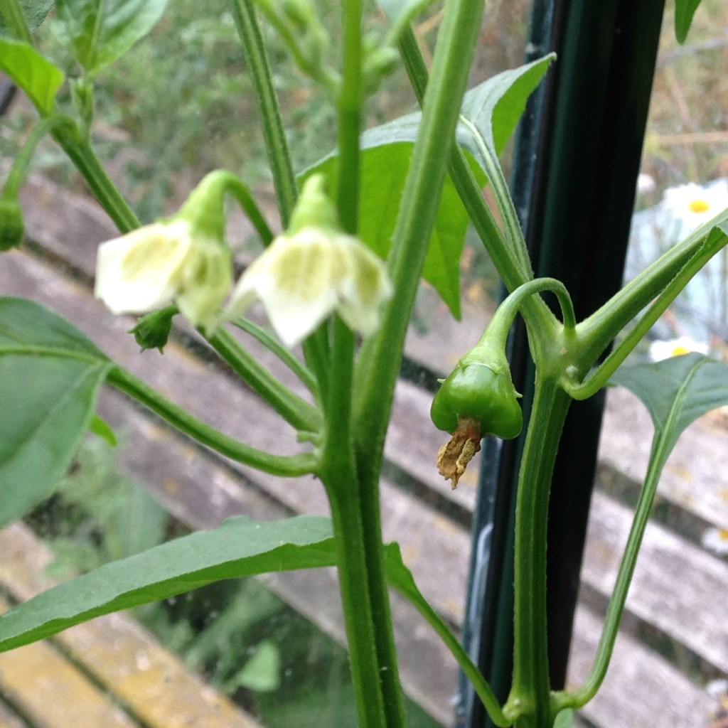 Another inherited pepper plant from my mother. Is it a chilli? Did the pack of seeds come free with a magazine? Has she labelled it correctly? Have I labelled it correctly? Ah, Google. It is a sweet pepper with a climbing habit. Might send it outside to climb up the shed then! No room in the greenhouse for your types Signor Gogorez.